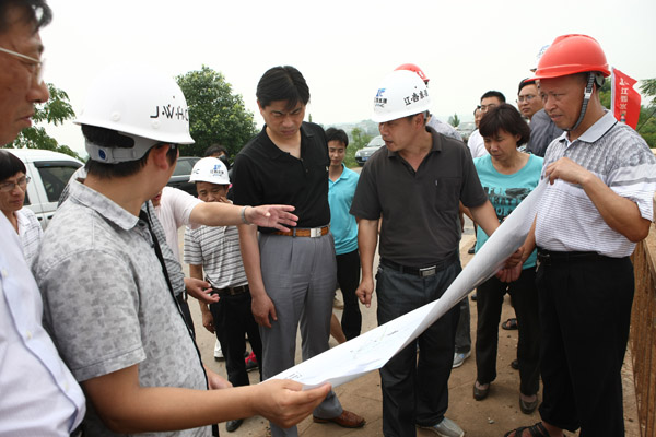 孫曉山廳長一行深入查看了樟山庫區(qū)防護(hù)工程的施工現(xiàn)場,并認(rèn)真聽取了我公司項目經(jīng)理彭紅軍對工程整體布置、進(jìn)度及工程施工中遇到的困難和問題等的簡要匯報。樟山防護(hù)工程施工戰(zhàn)線長、作業(yè)難度大、牽涉的范圍點(diǎn)多面廣,是峽江水利樞紐庫區(qū)防護(hù)工程施工難度最大的項目之一,孫廳長對工程進(jìn)展情況非常關(guān)心。聽取匯報后,孫廳長指出:一是要做好民生工程,做好移民、征地、拆遷等工作,為工程施工提供便利;二是要爭取早日施工,在早稻收割完成后立即進(jìn)行工程施工,確保工程于明年7月份完成主體工程;三要合理安排施工工期,確保峽江水利樞紐蓄水及第一臺發(fā)電機(jī)組按期發(fā)電。