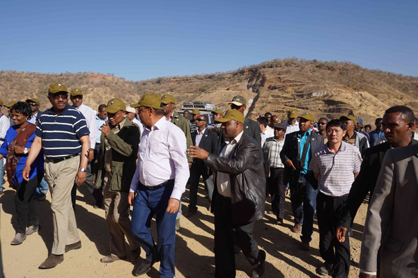 下午3時許,總統(tǒng)、總理和議長抵達工地后,就頂著40度的高溫馬不停蹄趕往主壩和灌溉隧洞引水渠,詳細視察現(xiàn)場情況。承包商Sur公司負責人Tadesse Yemane向三位領導報告了工程概況和現(xiàn)場進度,并介紹了整個大壩防滲的關鍵部分——基礎灌漿和瀝青混凝土芯墻——是由江西水建承建的。公司項目經(jīng)理黃生寶向三位領導簡要匯報了灌漿項目的完成情況,并表達了又好又快完成瀝青混凝土芯墻和灌溉隧洞的堅定決心和信心。領導們對我公司的成績表示肯定,希望我們再接再厲、優(yōu)質(zhì)高效地完成接下來的工作,為早日實現(xiàn)蓄水和灌溉做出努力。