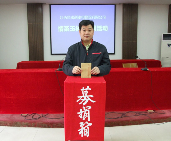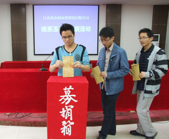 2010年4月14日,青海省玉樹縣發(fā)生兩次地震,最高震級(jí)7.1級(jí),造成了當(dāng)?shù)鼐薮蟮娜松韨龊拓?cái)產(chǎn)損失,“玉樹地震”牽動(dòng)著億萬人民的心,也牽動(dòng)著我司所有員工的心!公司在全司范圍內(nèi)積極開展“情系玉樹募捐活動(dòng)”,4月26日,我公司南昌市機(jī)關(guān)總部首先開展了“情系玉樹募捐活動(dòng)”,公司中層以上管理人員和員工踴躍參與募捐活動(dòng),紛紛獻(xiàn)上自己的一份愛心,體現(xiàn)出江西水總?cè)说纳鐣?huì)責(zé)任感!同時(shí),各分公司、國(guó)內(nèi)外施工項(xiàng)目部也在開展此項(xiàng)活動(dòng),預(yù)計(jì)此項(xiàng)活動(dòng)將募得資金3萬余元。