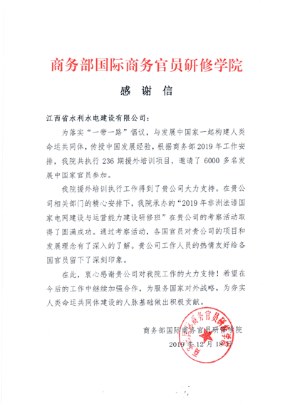 人力資源2019年,公司圍繞國家和我省“走出去”戰(zhàn)略,積極配合商務(wù)部及省內(nèi)援外培訓(xùn)工作,得到各方認(rèn)可。近日,公司收到來自商務(wù)部國際商務(wù)官員研修學(xué)院的感謝信,信中提到,商務(wù)部研修學(xué)院援外培訓(xùn)工作得到我公司的大力支持,“2019年非洲法語國家電網(wǎng)建設(shè)與運營能力建設(shè)研修班”考察、交流活動取得圓滿成功,對公司的積極配合表示衷心感謝。