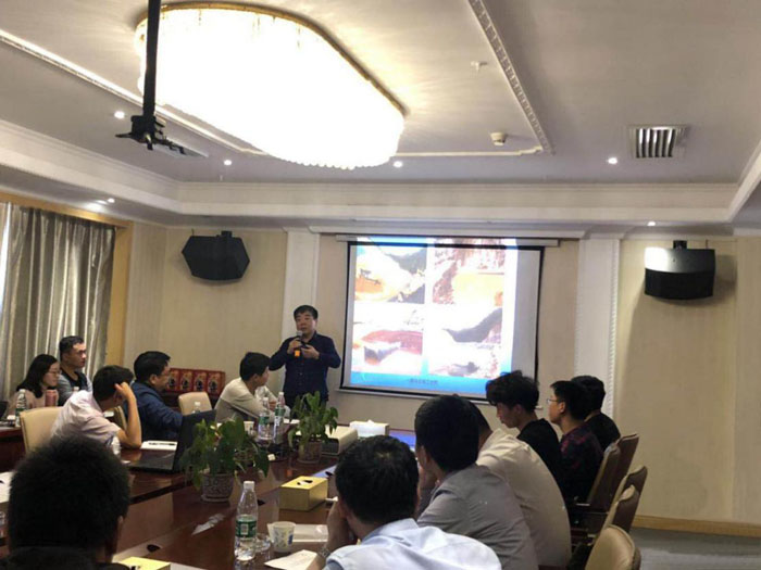 現(xiàn)場參觀結(jié)束后,學習團參加了技術(shù)培訓和經(jīng)驗交流會??偨?jīng)理助理杜凌主持了開班儀式??偣こ處熀櫥?、項目副經(jīng)理李成,對洋前壩水庫的大壩總布置、大壩施工導流、大壩及供水管道施工技術(shù)細節(jié)等,通過文字、圖片、視頻等組成的PPT課件為學員授課,并就學員提出的問題逐一進行了解答。